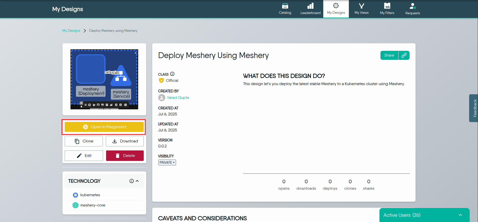 1. Log in to Meshery Playground. After successfully logging in, you'll land on the dashboard.