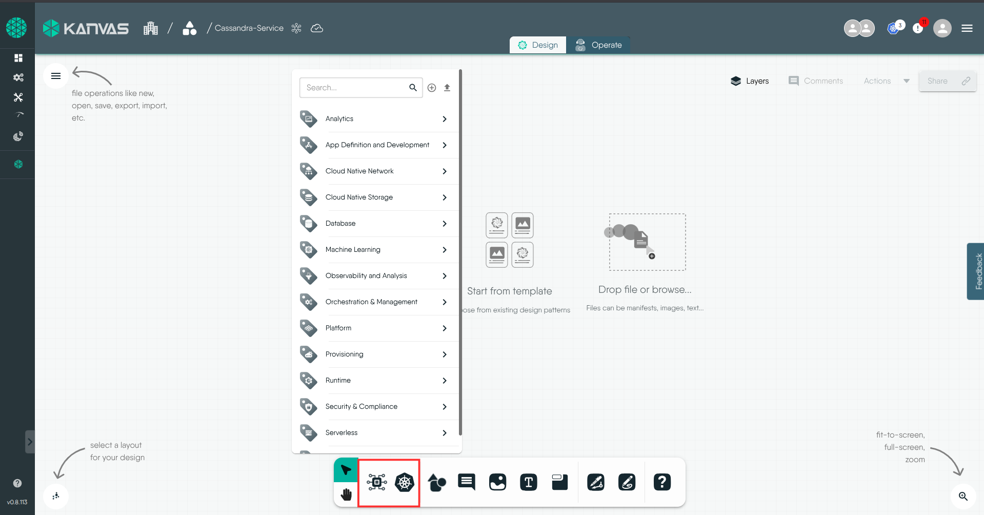 With the Designer toolbox at your disposal, effortlessly construct complex cloud-native deployments. Simply drag and drop components onto the Kanvas canvas, arranging and configuring them in a way that suits your architecture.